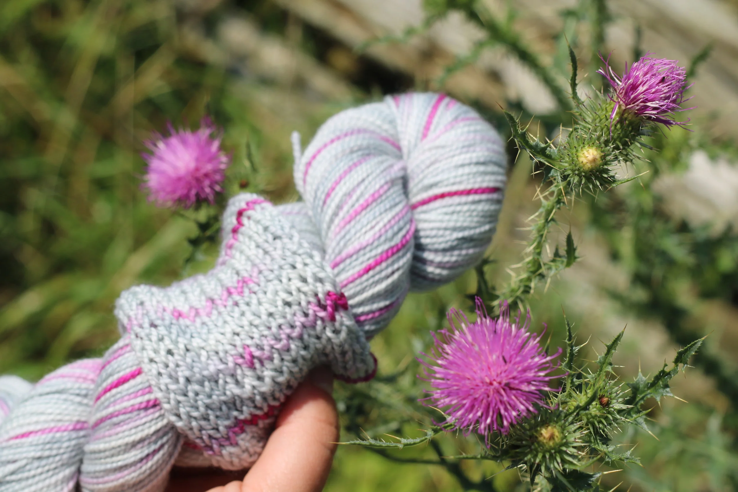 Colour twin to the pretty thistles on the farm, P002 is one of our new KPPPM colours dreamed up this July as part of the Slate concept series. Look how beautifully it knits up!
