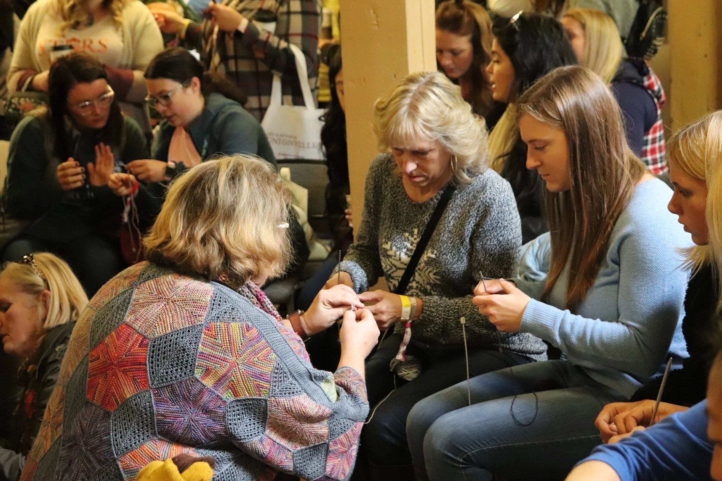 This past Friday, we headed to Gilmore Girl Fan Fest in Unionville, Ontario, where we participated in the Knit-a-thon! With a room full of newbie knitters, we alongside the owners of Knit School to on teaching as many knitters as we could at the event! Along with teaching people to knit, we brought some of our favourite projects to show and demonstrate with knitting what you can create.