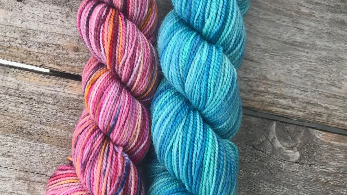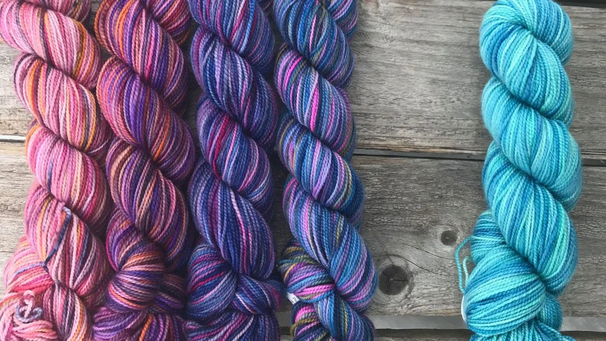 In order to blend these colours together you have to start pairing with one, and work your way to the final blue in this case. We start with a colour with similar pink and yellow orange as the first skein.