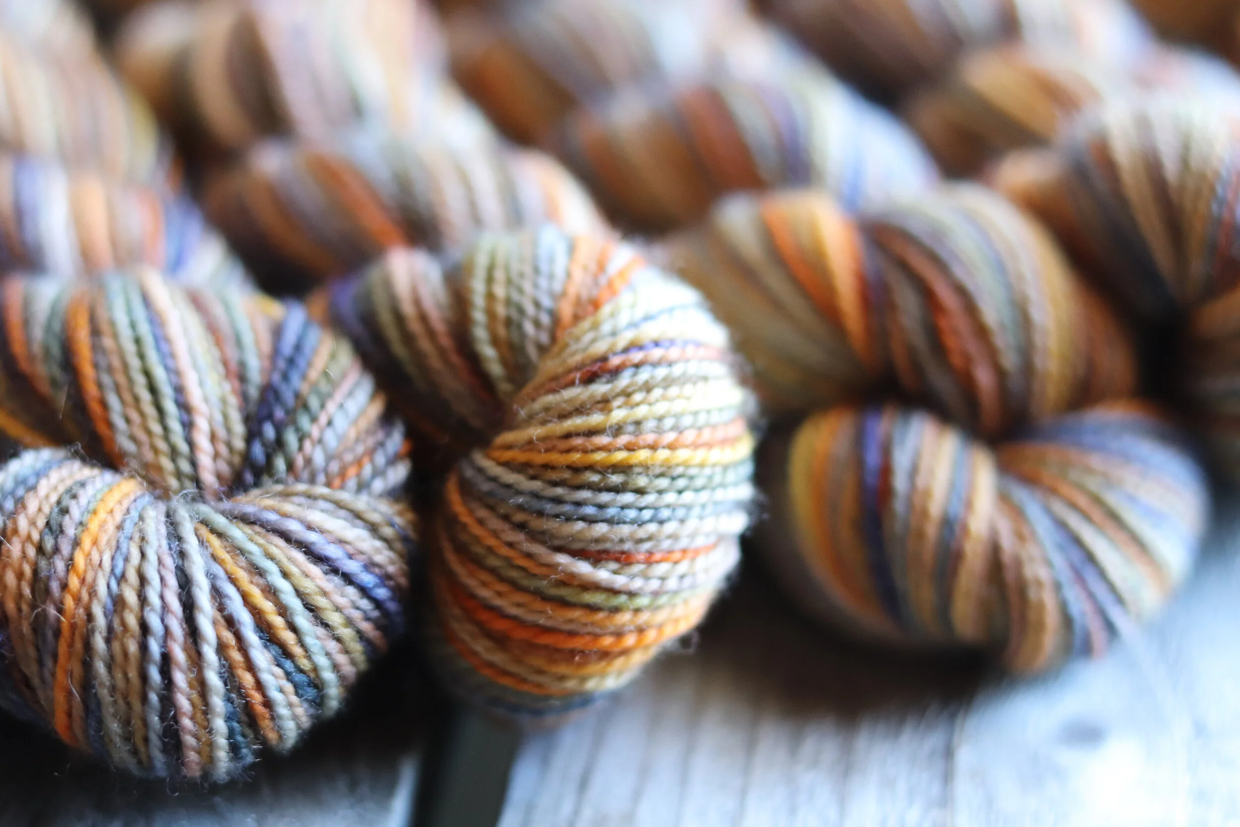 Dyed using a new “sun dye” technique, inspired by dawn at the farm, this colour includes various shades of yellow, brown and green. Due to the technique no two skeins are alike, forming a mystery in every stitch.