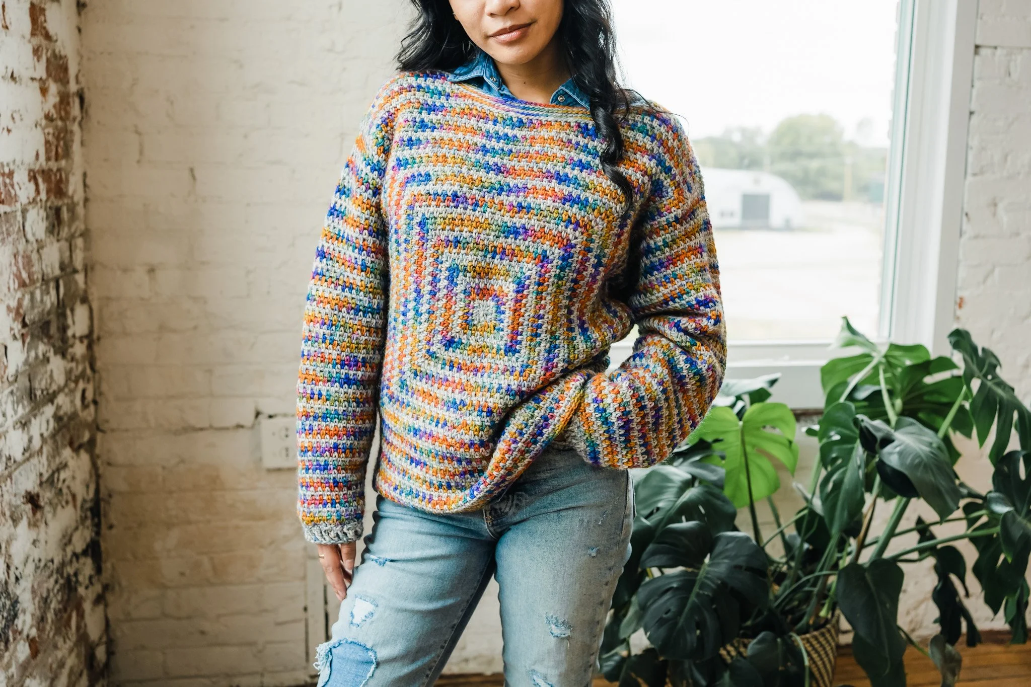 This beautiful sweater is crocheted with Corriedale+Gotland yarn, our natural grey Koigu Origins yarn. The pattern is sized from XS to 3XL with instructions to adjust sizing. As described by Toni this oversized cozy pullover features the linen stitch square for the front and linen stitch stripes for the back and sleeves. Alternate colors for a lively ripple effect. Or, go low contrast on your stripes for a more subdued and traditional sweater. Layer it over your favorite chambray or plaid collared shirt for the perfect final touch.