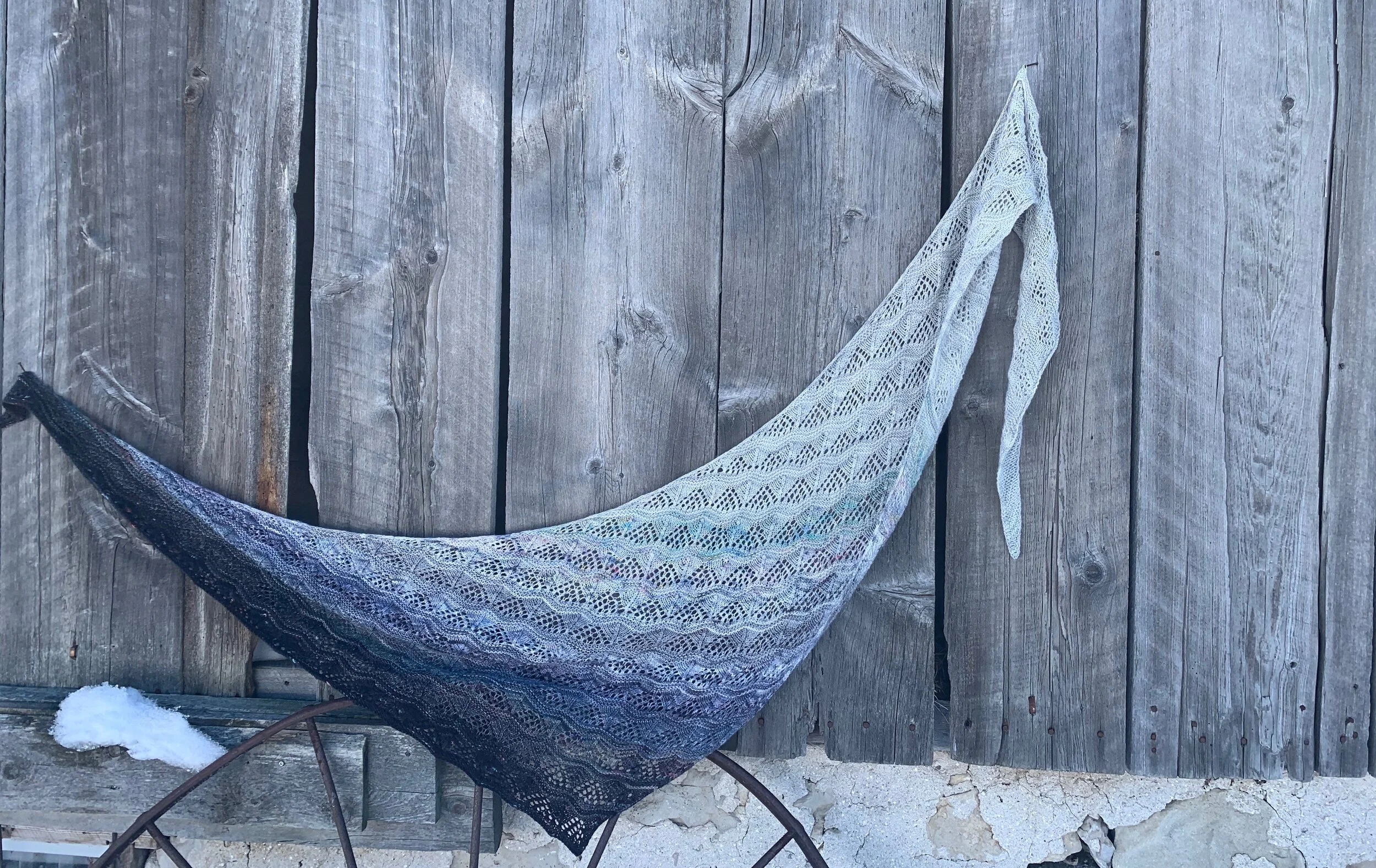The newest shawl to be released by Ambah O’Brien, is just as beautiful as the last. This shawl features an airy lace pattern, in a a fade of both solid and variegated Koigu yarn. The shawl kit is one pencil box and two skeins of KPM. Ambah’s original colour is a beautiful soft pink to Bordeaux, and we’ve created four other colour options kitted to choose from. Find the pattern here.