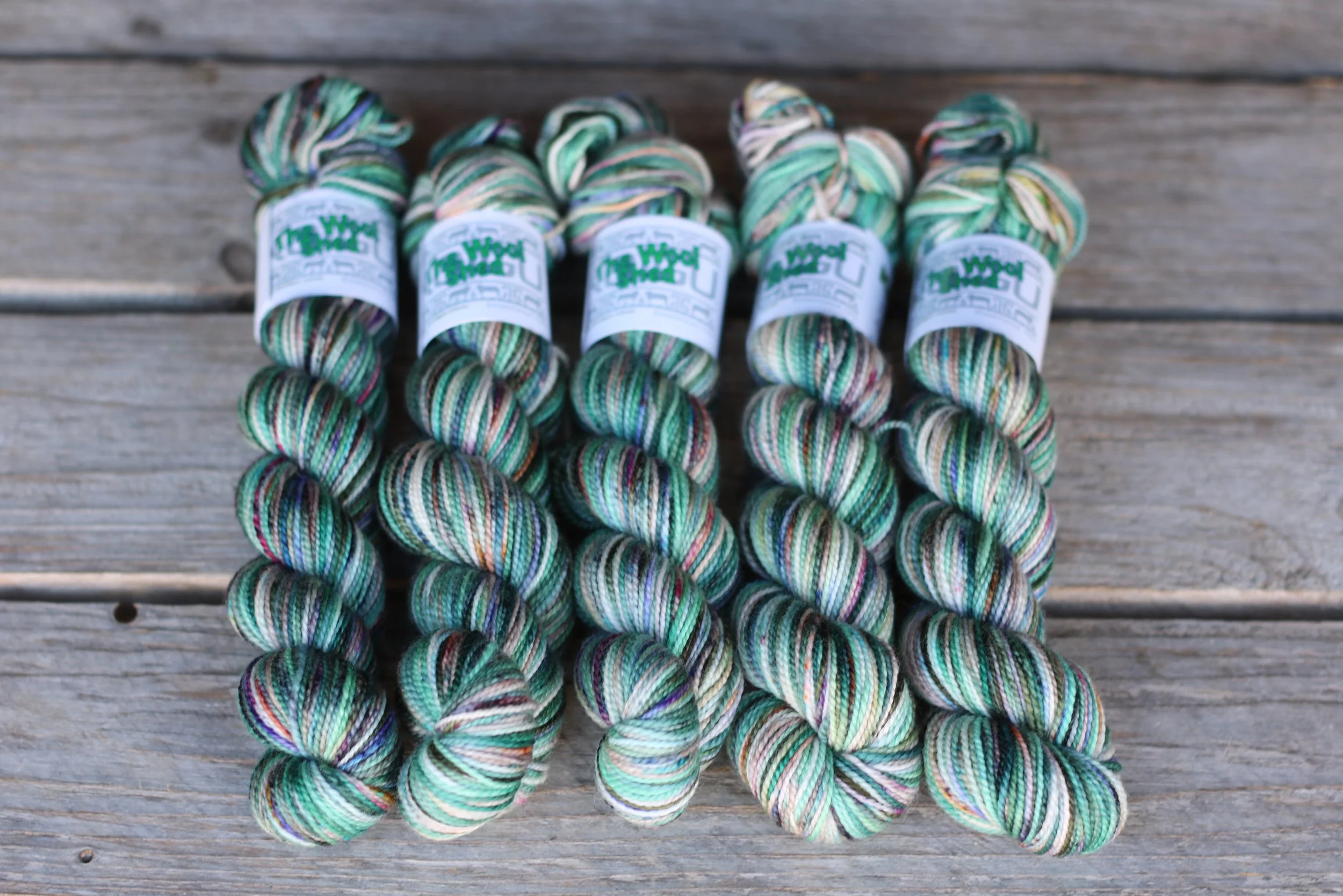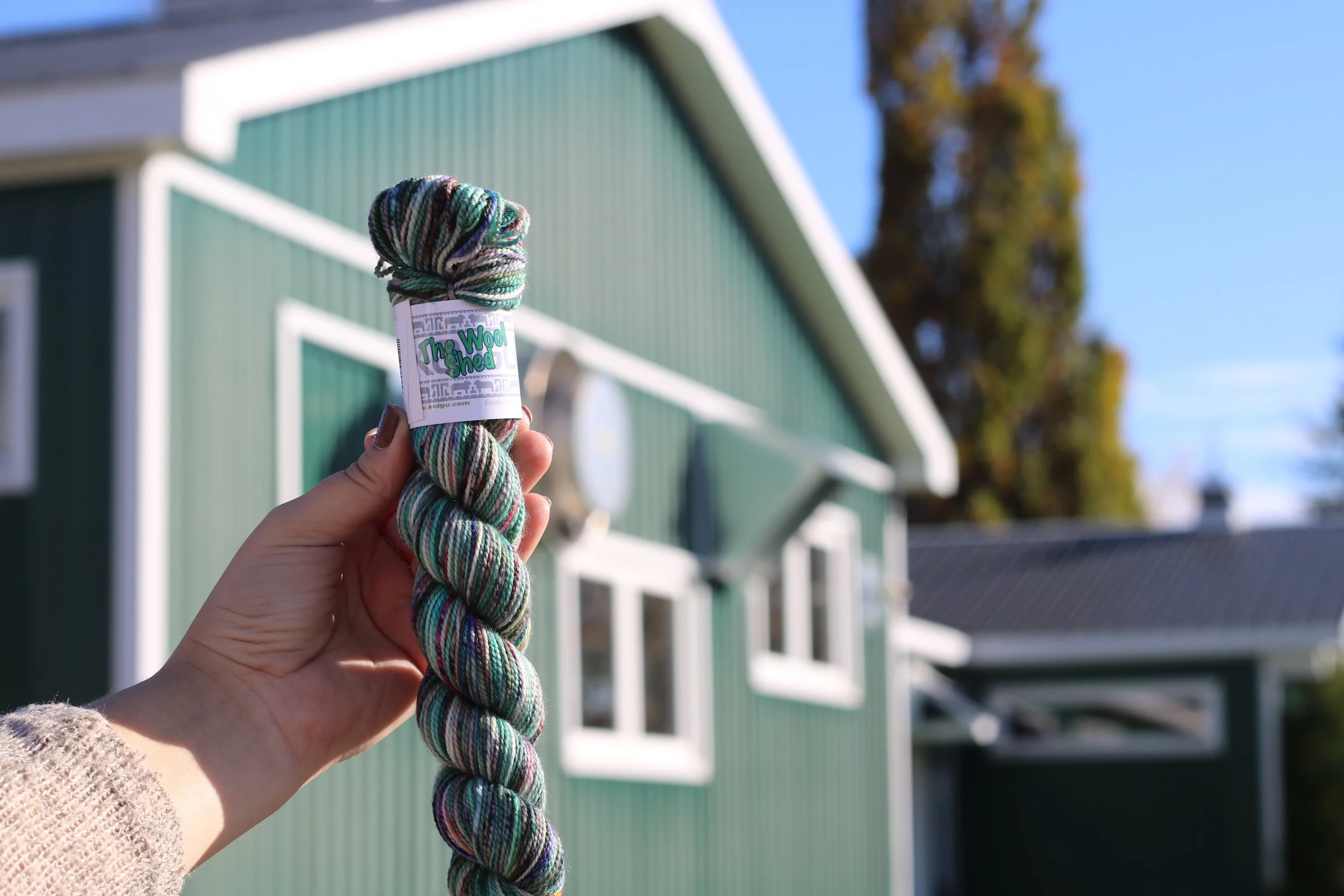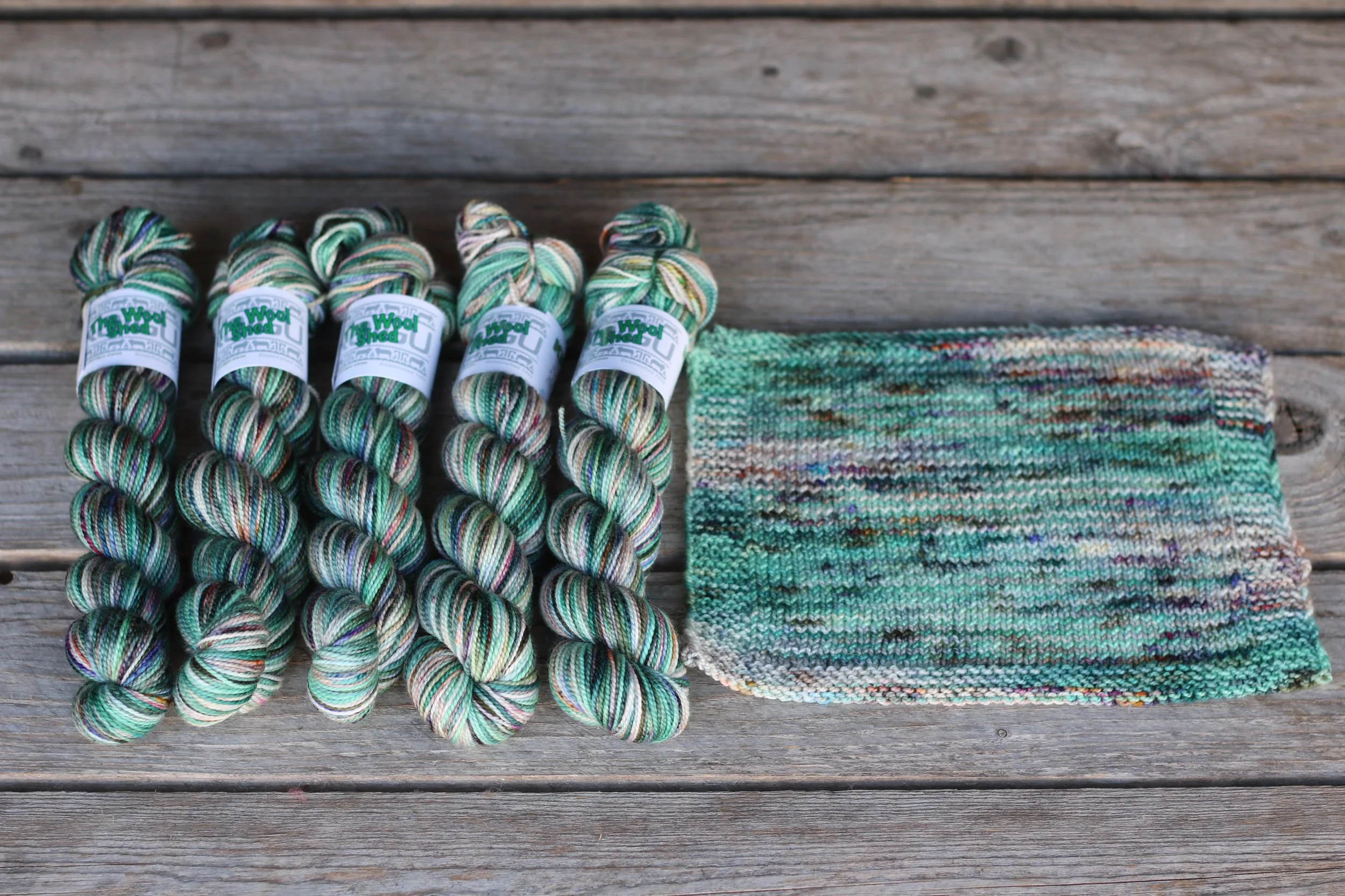 Now you can take the Koigu Wool Shed home with you for your next knit project. This special edition KPPPM is complete with speckles of dark brown mixed in with the variegated green and white. Look how beautifully it knits up!