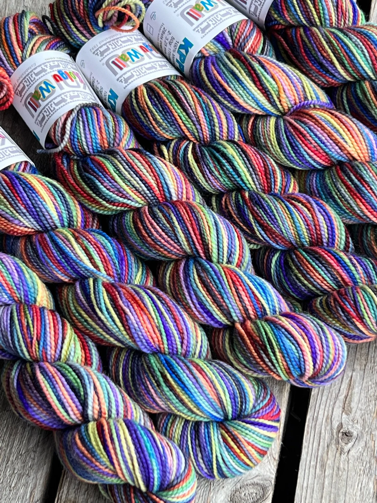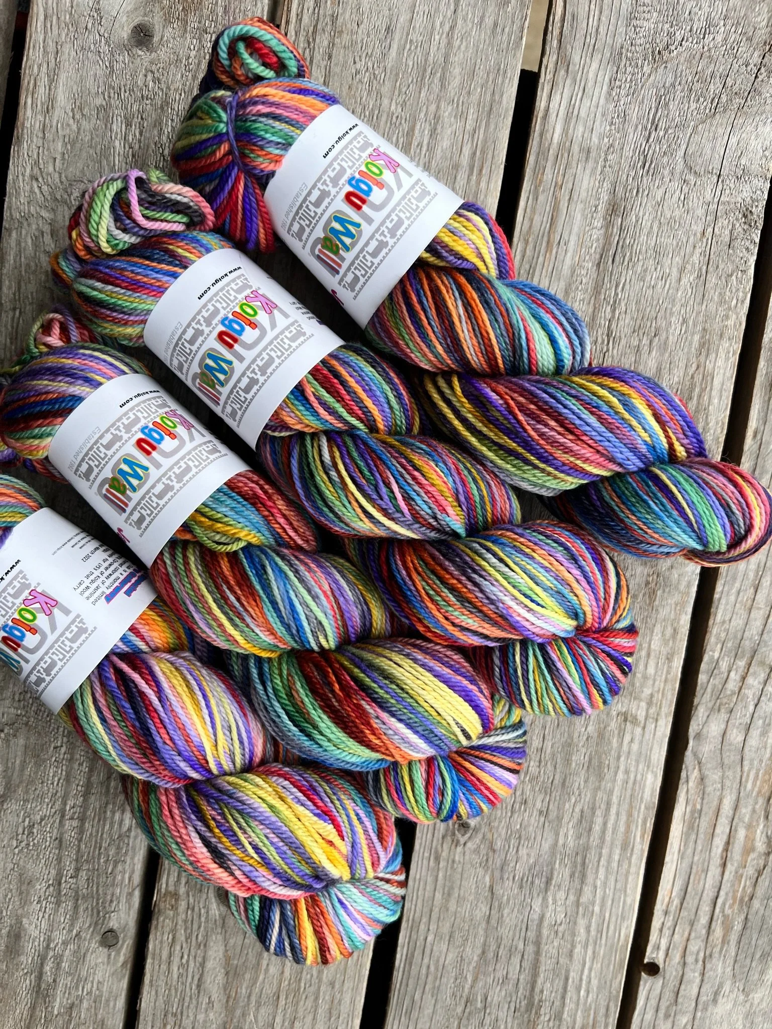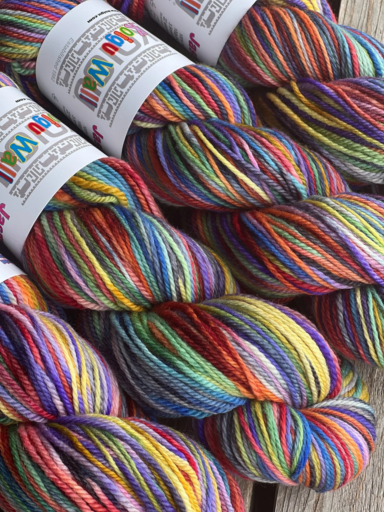 For March our Collector Colour was inspired by the infamous Koigu Wall. If you have ever had the opportunity to visit the Koigu Farm you know the wall as an iconic stop on the tour. A home for the ends of a dyelot, skeins that didn’t make it in the kit creating a stunning rainbow showcasing skeins from many years of Koigu hand dying. Our favourite part of visiting LYS’s is seeing their Koigu walls up close in person, later in this blog post we showcase some of our favourites. Creating a dyelot that incorporates the aura of the wall was a difficult task, however we are so happy with the way this dyelot turned out.