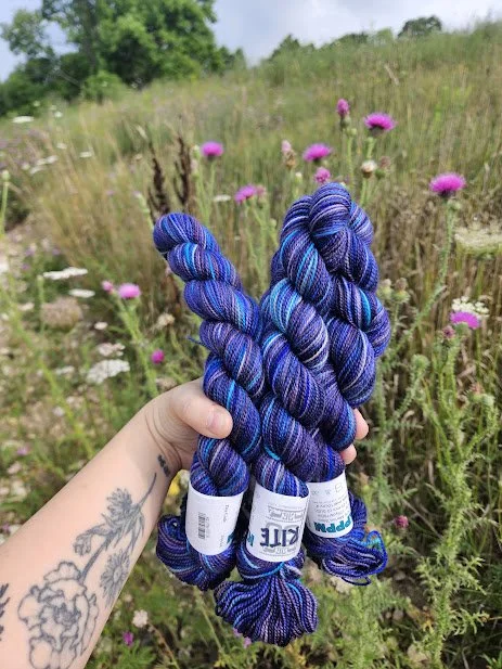 This month’s collector colour, AZURITE is in KPPPM fingering weight 100% Merino on a dark indigo base with electric pops of shades of blue and green.