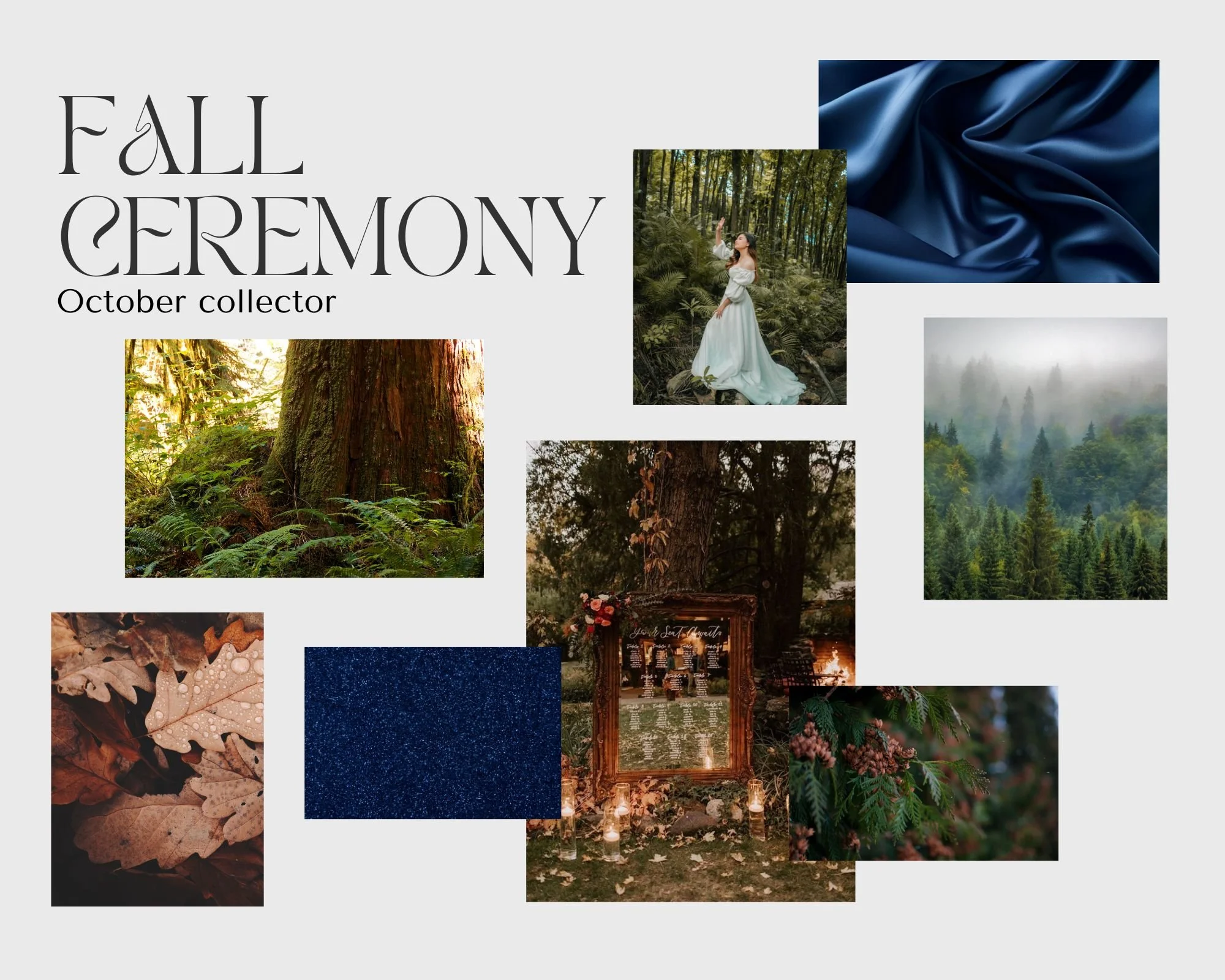 FALL CEREMONY is inspired by the rich dark colours of autumn and the deep blue that will be throughout Kersti’s wedding and in the night sky above the party. On a background of midnight blue, splashes of autumnal hues add warmth to this collector colourway.