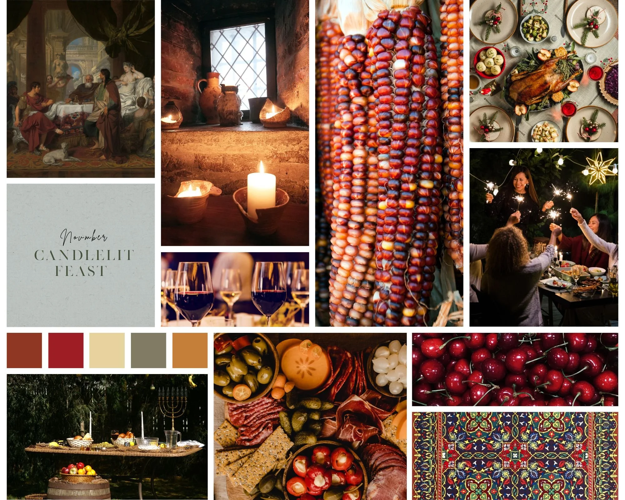 CANDLELIT FEAST is inspired by the cozy richness of a dimly lit winter night spent with loved ones surrounded by warm food. Velvety reds, waxy golds and warm sages blend into this decadent limited edition colourway.