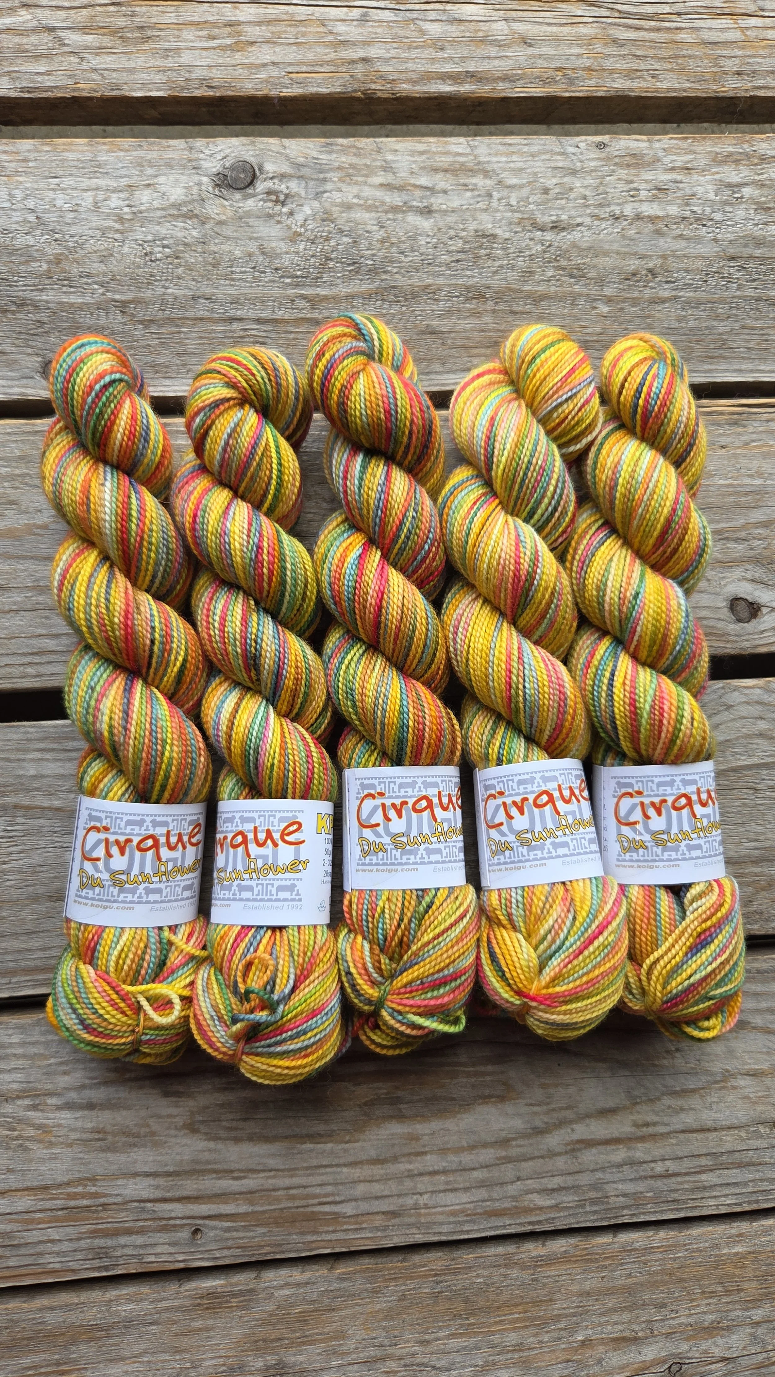 Golden yellows, cheerful reds, with deep jewel tones for contrast and a hint of black for the sunflower seeds. Hand-painted on a 100% merino fingering weight base.