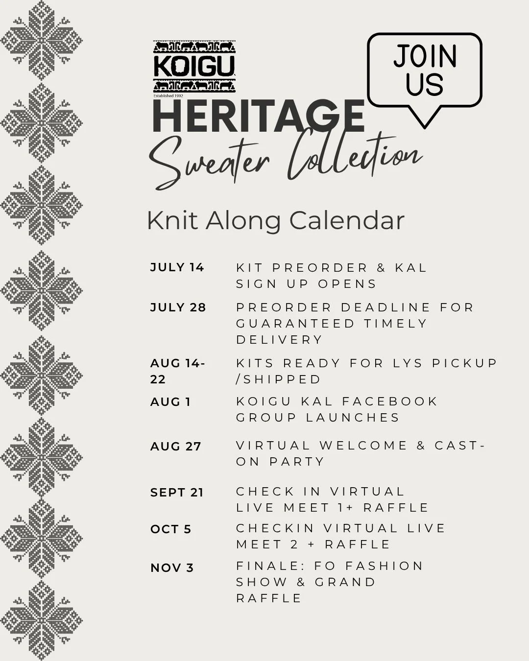 We are hosting a colourwork sweater KAL including virtual live meetups, raffle prizes, instructional videos and more. (schedule below)