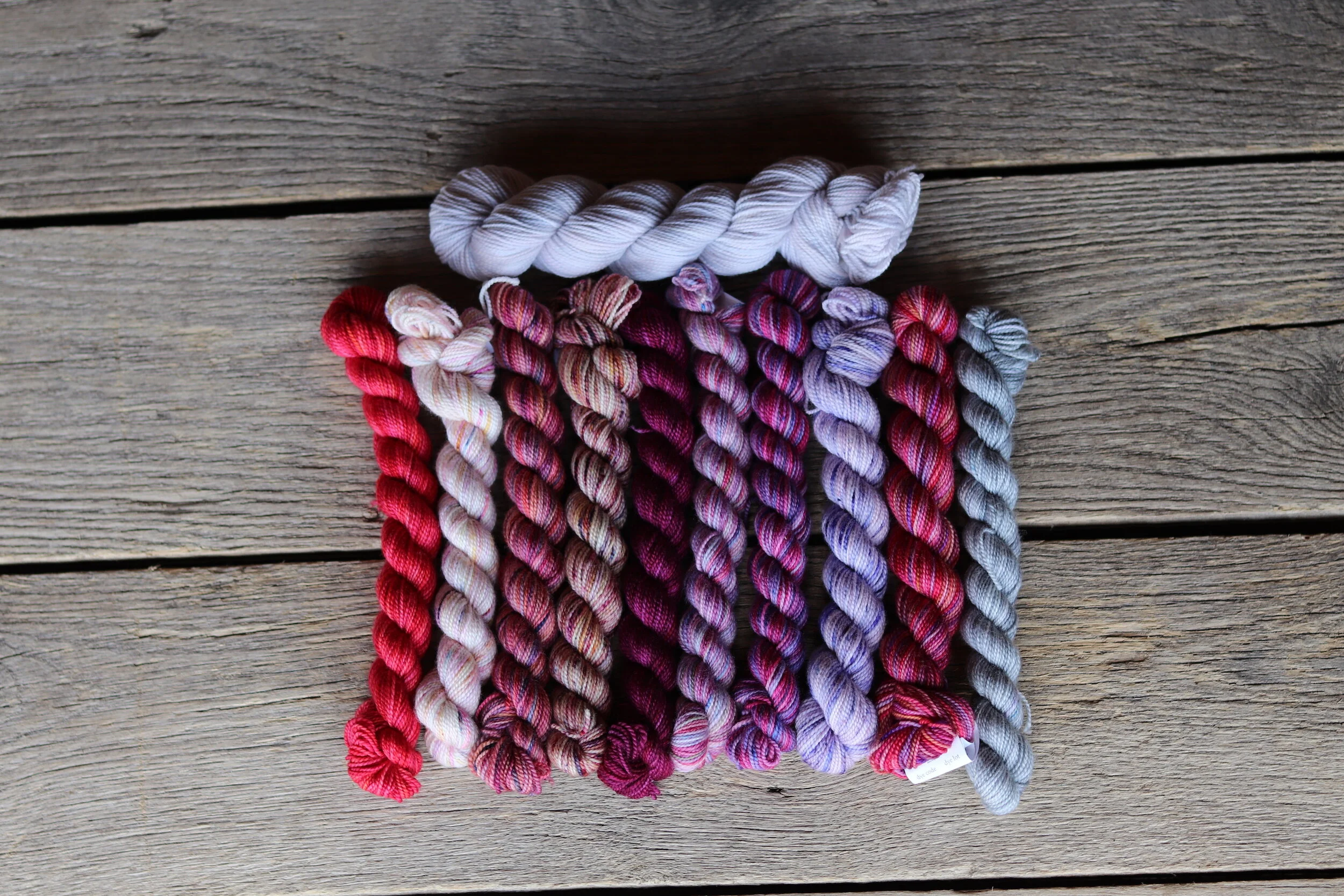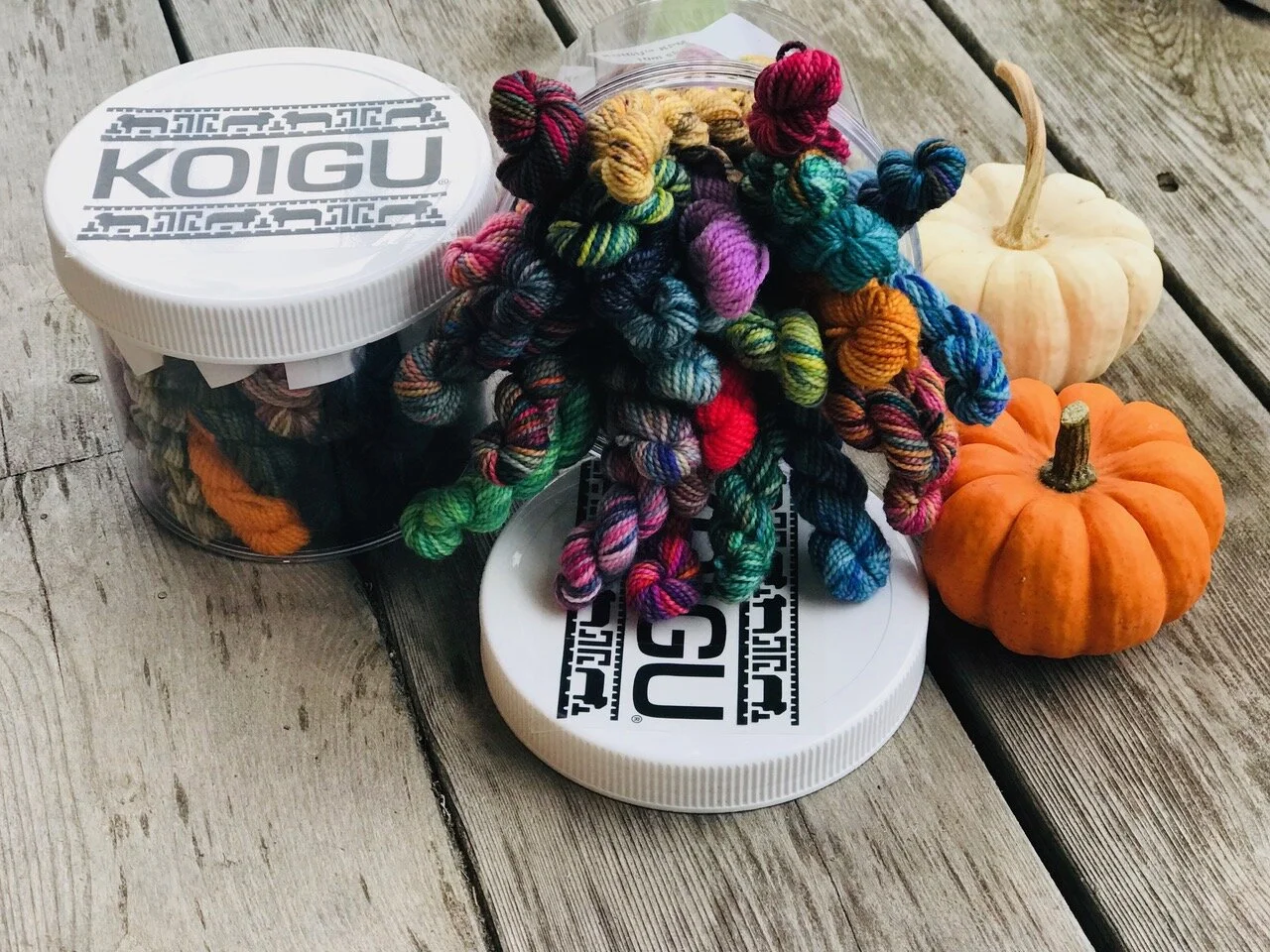 The Cookie Jar kit incorporates Koigu mini skeins in a rainbow colour theory.