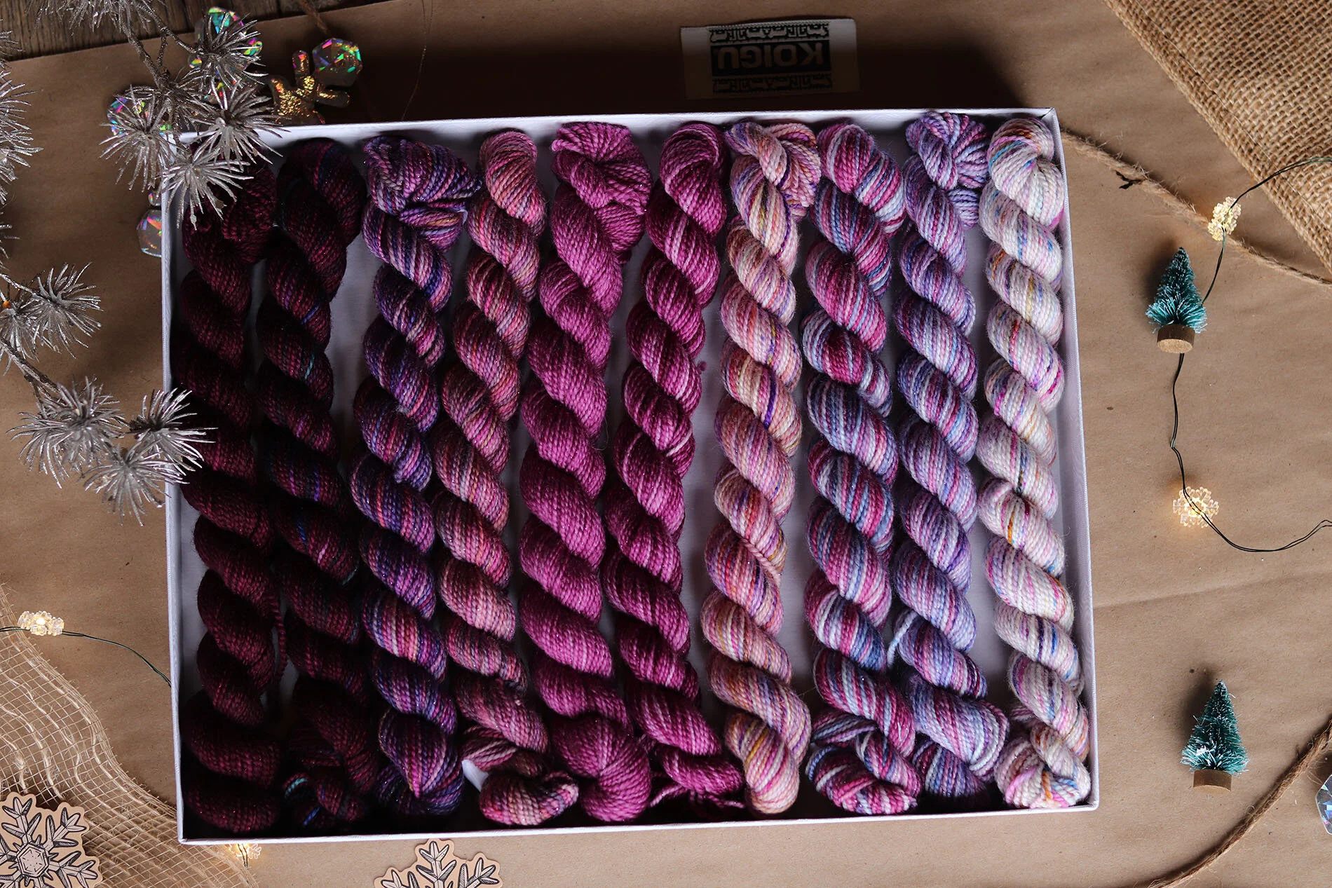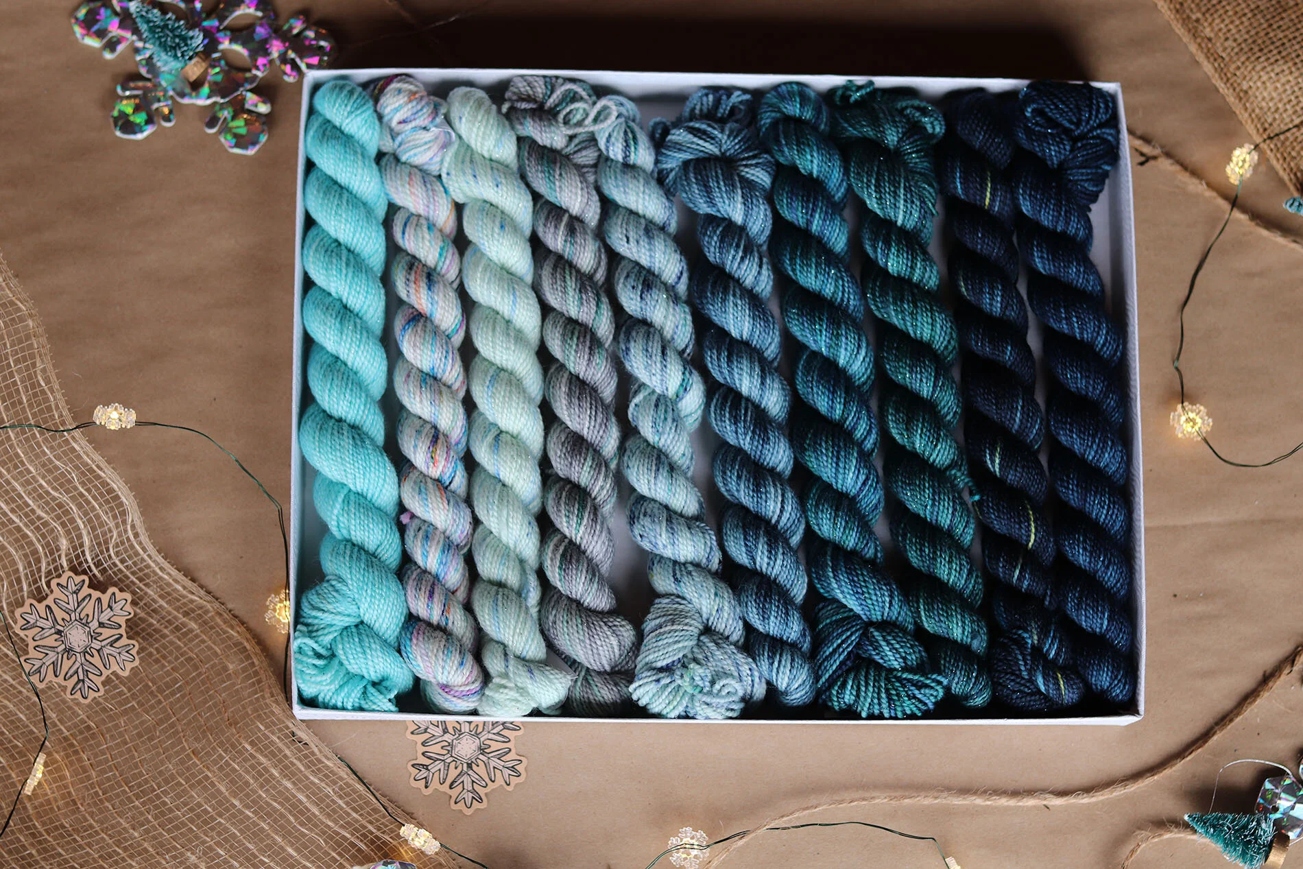 Koigu Mori Pencil Box features 10 skeins of Koigu Mori our Merino/Silk blend. We currently have three colour options Dreams, Evergreen and Snowflake.